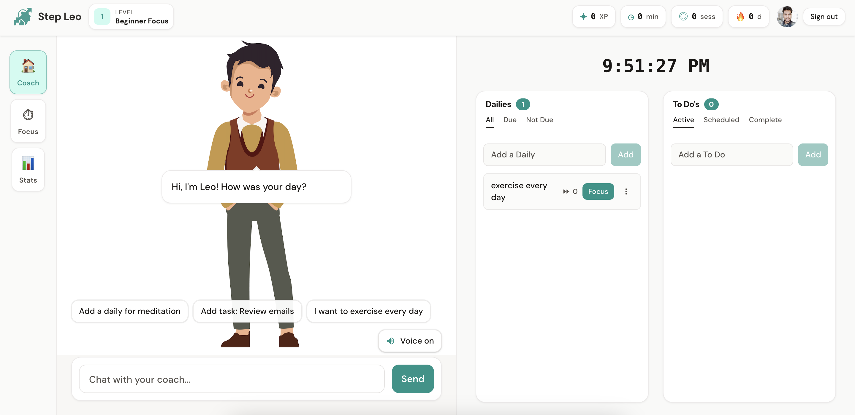 Stepleo is an AI-powered focus app. You chat with the coach to add dailies (repeating habits) and todos, then run 25-minute Pomodoro focus sessions on one task at a time. You earn XP and levels, build focus streaks, log distractions without guilt, and see your progress in a stats dashboard with a heatmap and achievements.